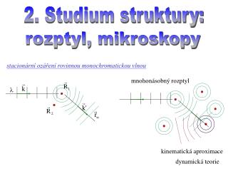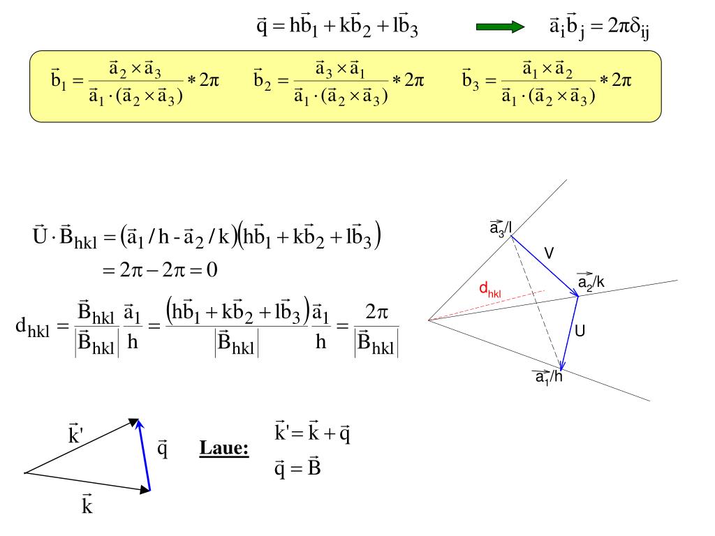 Zahrnuje superpozici vlnových front rozptýlených mřížkovými rovinami, což vede k přísnému vztahu mezi vlnovou délkou a rozptylovým úhlem, případně k přenosu vlnovodu s ohledem na krystalovou mřížku. Když je difrakční vektor totožný s nějakým vektorem g hkl reciproké mříže, je tento difrakční vektor kolmý k osnově rovin (hkl) a je půlen rovinou z osnovy (hkl) procházející počátkem přímé mříže krystalu. Zahrnuje superpozici vlnových front rozptýlených mřížkovými rovinami, což vede k přísnému vztahu mezi vlnovou délkou a rozptylovým úhlem, případně k přenosu vlnovodu s ohledem na krystalovou mřížku.