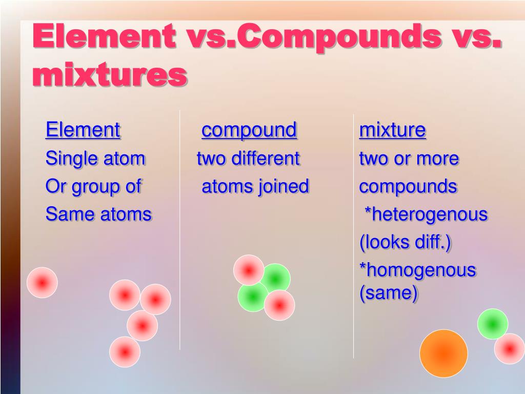 An element is a substance that contains only one type of atom as its repeating unit. This bond is a link between the nuclei of the atoms and the electrons present. Is a substance in which two or mor. The terms element, molecule, and compound, have different definitions and properties as discussed below in this article. An important distinction is the clarity of molecule, compound and mixture. Represents an item composed of an element, compound, or mixture. Chemists like to throw around a lot of different terminology. A compound contains two or more different atoms joined together... An element is a substance that contains only one type of atom as its repeating unit.